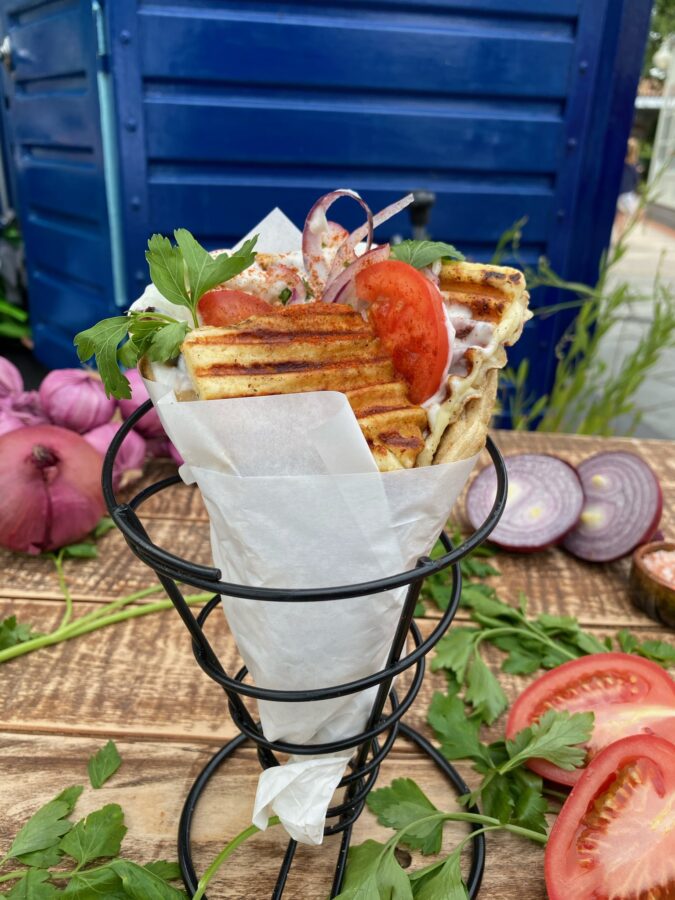 This wrap is filled with buttery and creamy halloumi cheese. You can choose the main sauce between tzatziki and our homemade avocado sauce. Comes served with vine tomatoes and red onions with fresh parsley. When the souvlaki is ready and wrapped with the hot and fluffy pitta bread, it’s sprinkled with sweet paprika.